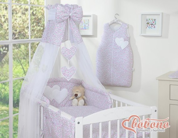 2. Dwa wiszące serduszka z miękkim wypełnieniem to słodkie i niepowtarzalne uzupełnienie kompletu pościeli. Idealnie pasują do aplikacji serduszek znajdujących się na ochraniaczu, przyciągają uwagę dziecka w pierwszych miesiącach życia skutecznie zastępując karuzelkę. Duża gruba kokarda stanowi piękne zwieńczenie całości.