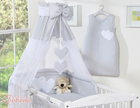 2.Dwa wiszące serduszka z miękkim wypełnieniem to słodkie i niepowtarzalne uzupełnienie kompletu pościeli. Idealnie pasują do aplikacji serduszek znajdujących się na ochraniaczu, przyciągają uwagę dziecka w pierwszych miesiącach życia skutecznie zastępując karuzelkę. Duża gruba kokarda stanowi piękne zwieńczenie całości.