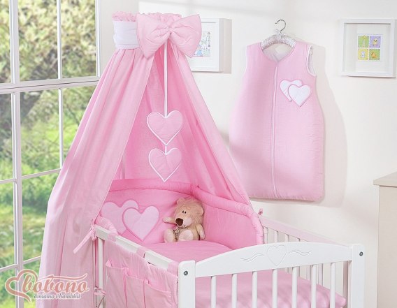 + Wiszące dwa serduszka+duża gruba kokarda - Dwa wiszące serduszka z miękkim wypełnieniem. Przyciągają uwagę dziecka w pierwszych miesiącach życia skutecznie zastępując karuzelkę. Duża gruba kokarda stanowi piękne zwieńczenie całości.