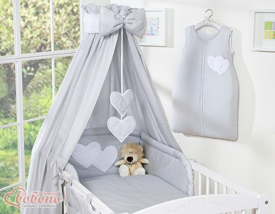 Duży baldachim bawełniany 160x250 cm- można go ładnie ułożyć wokół łóżeczka, ozdobnie pomarszczyć lub nawet umocować na dłuższym boku łóżeczka. Baldachim jest długi niemal do ziemi, poniżej dolnych szczebelków łóżeczka, nie będzie więc wpadał do wewnątrz nawet przy materacu opuszczonym na najniższym poziomie łóżeczka - jak to się niestety często dzieje przy tańszych pościelach, oszczędnie krojonych. Baldachim z tkaniny wykonany jest z tkaniny 100% bawełnianej, posiadającej atest Okotex lub TUV. + Wiszące dwa serduszka+duża gruba kokarda - Dwa wiszące serduszka z miękkim wypełnieniem. Przyciągają uwagę dziecka w pierwszych miesiącach życia skutecznie zastępując karuzelkę. Duża gruba kokarda stanowi piękne zwieńczenie całości.