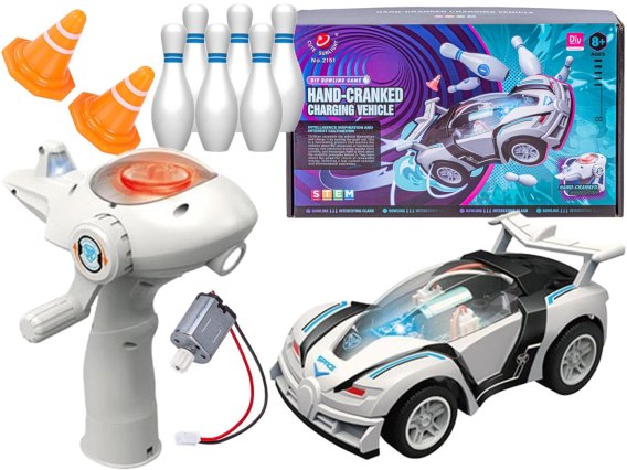 Montujemy zestaw zgodnie z szczegółową, obrazkową instrukcją montażu dołączoną do opakowania. Następnie łączymy pilot z autkiem za pomocą przewodu i kręcimy korbką. Następuje ładowanie akumulatora. W kolejnym kroku odłączamy auto, odłączamy przewód i przesuwamy włącznik w pozycję ON. Nasze autko jest gotowe do jazdy - po położeniu na powierzchni - pomknie do przodu. Ustaw kręgle i zagraj z przyjaciółmi. Sprawdźcie kto strąci ich więcej :)