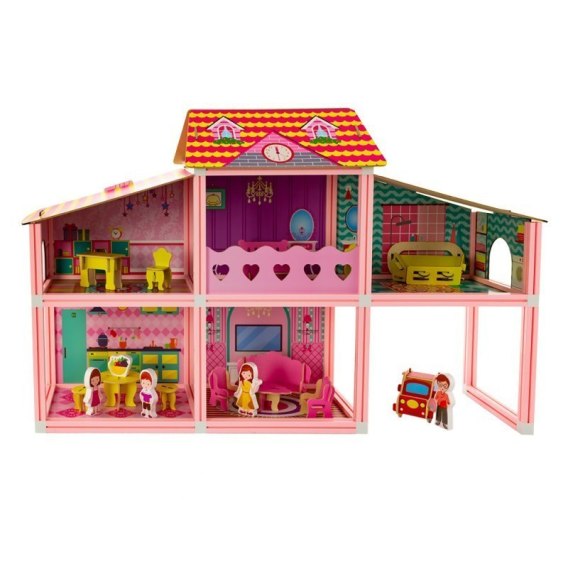 Domek dla lalek z akcesoriami. Model posiada łatwą do złożenia plastikową konstrukcję z możliwością dowolnego łączenia. Domek posiada na wyposażeniu drewniane meble, ściany oraz podłogi. Do zestawu dołączone są drewniane figurki.
