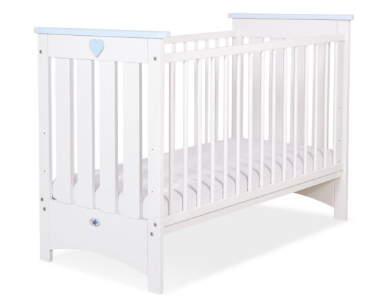 Białe drewniane łóżeczko z grubego solidnego drewna. Błękitne ozdobne listwy na frontach łóżeczka i błękitne serduszko z przodu łóżeczka tworzą delikatny pastelowy akcent ozdobny. Drewniane łóżeczko dla niemowląt - spełniające aktualną normę PN-EN 716-1:2017