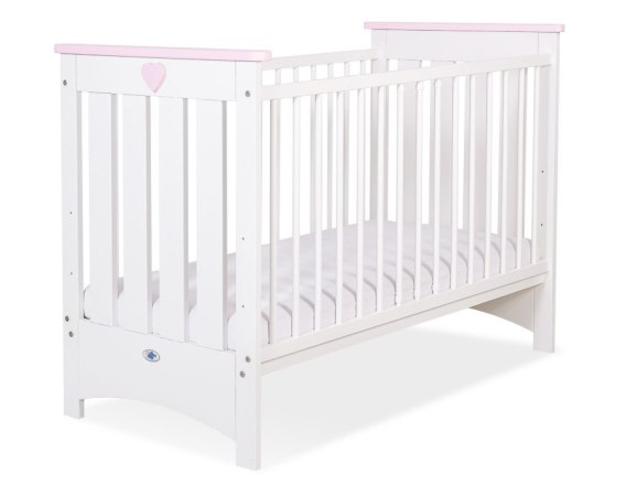 Białe drewniane łóżeczko z grubego solidnego drewna. Jasnoróżowe ozdobne listwy na frontach łóżeczka i jasnoróżowe serduszko z przodu łóżeczka tworzą delikatny pastelowy akcent ozdobny. Drewniane łóżeczko dla niemowląt - spełniające aktualną normę PN-EN 716-1:2017