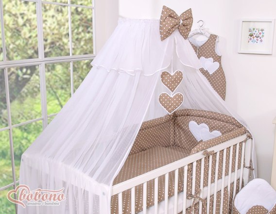 Duża moskitiera do łóżeczka dziecięcego z białego szyfonu z serduszkami i kokardą - grochy na brązie