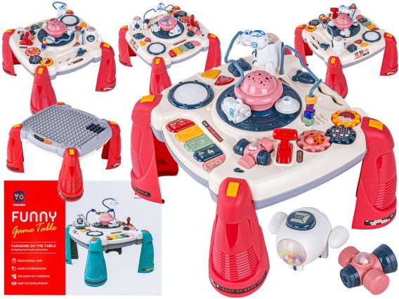 Stolik zawiera muzyczne przyciski oraz pianinko, które może odtwarzać pojedyncze dźwięki lub po zmianie trybu wesołe melodie.