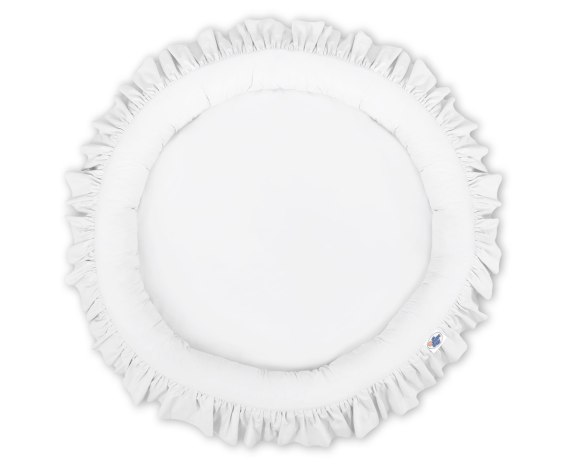 Oryginalne gniazdko z falbanką. Funkcjonalne i praktyczne. Doskonale sprawdzi się jako mini basenik, mata do zabawy lub "podłoga" baldachimu. Szerokie, okrągłe i mięciutkie ścianki zapewnią bezpieczną i udaną zabawę dla każdego malucha. Gniazdko może być używane już od pierwszych dni życia jako wygodny i bezpieczny kokon niemowlęcy a później jako przytulne miejsce do zabawy. Pokrowiec wykonany jest z tkaniny 100% bawełnianej, posiadającej atest Okotex. Boki gniazdka wypełnione są atestowanym włóknem Eco Fillball – mięciutkim włóknem uformowanym w malutkie kuleczki. Dzięki specjalnej technologii produkcji kuleczki te są puszyste i sprężyste, a przy tym w dotyku są miękkie i delikatne jak puch, zapewniają odpowiednią cyrkulację powietrza. Dno gniazdka, to specjalna wkładka wykonana z nowoczesnego antyalergicznego atestowanego surowca. Gniazdko łatwo utrzymać w czystości, pokrowiec jest rozbieralny - można prać w pralce w 30 stopniach.