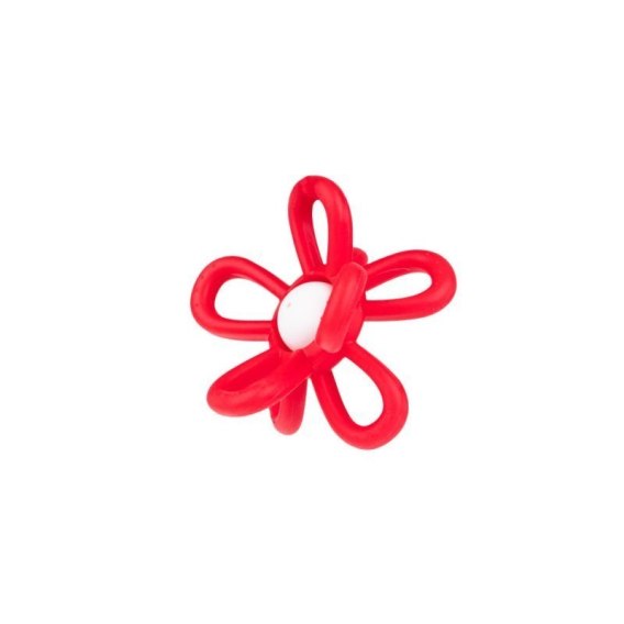 Czerwona grzechotka w kształcie kwiatka nie tylko pięknie wygląda, ale jeszcze wydaje wesoły dźwięk przy potrząsaniu. We wnętrzu zabawki kryje się grzechocząca kula, a naokoło niej znajdują się płatki w formie elastycznych pętelek. Ich kształt został stworzony specjalnie dla małych rączek, aby ułatwiać najmłodszym chwytanie zabawki. Praktyczne wypustki, zdobiące pętelki, pozwolą korzystać z nich także w formie gryzaka.