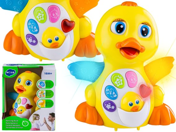 Tańcząca kaczuszka to świetna zabawka, która przyniesie wiele frajdy zarówno dzieciom jak i rodzicom. To wesołe kaczątko nie tylko bawi, ale również uczy - pozytywnie wpływa na koordynację ruchową, wzrok, słuch, motorykę oraz wrażliwość muzyczną. Żywa kolorystyka z pewnością również zachęci Twojego malucha do zabawy.