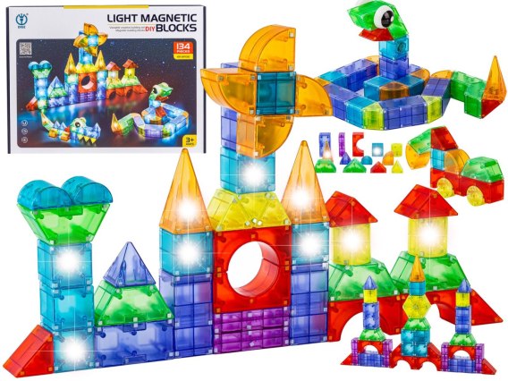 Klocki Magnetyczne, Konstrukcyjne, Świecące Elementy, Figury 3D 134 El.
