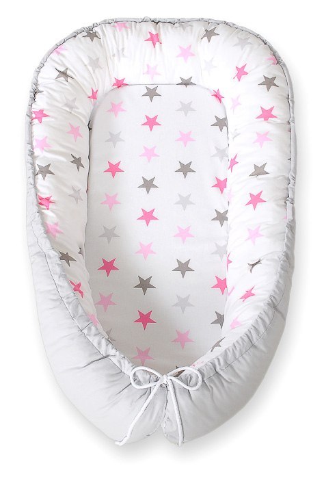 • Kokon niemowlęcy dwustronny kojec otulacz Premium BOBONO- gwiazdy różowo-szare/szary