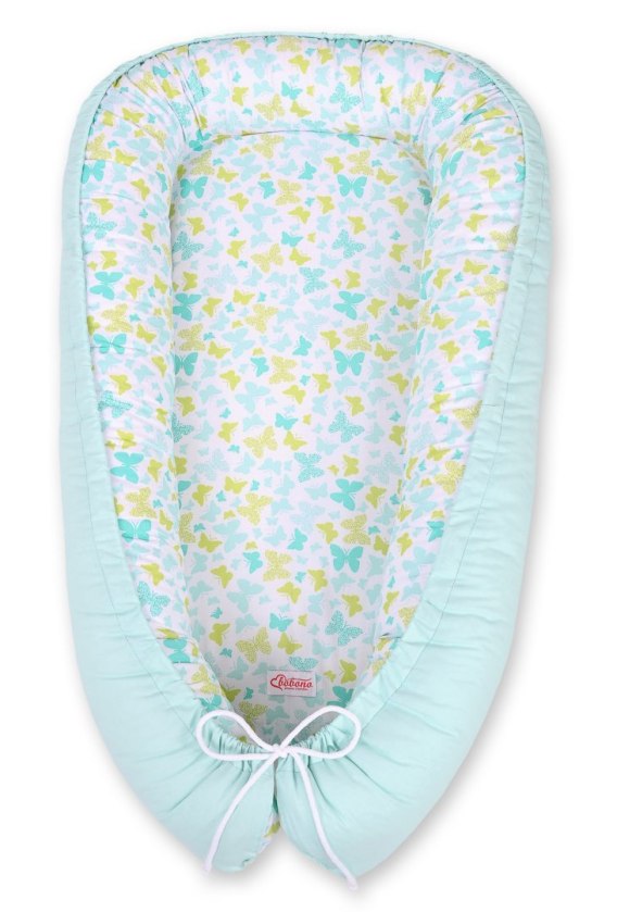 • Kokon niemowlęcy dwustronny kojec otulacz Premium BOBONO- motylki niebieskie/ mięta