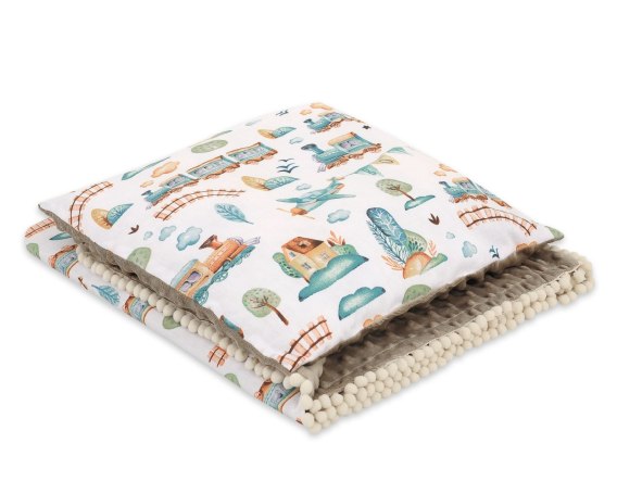 Dwustronny kocyk ozdobiony dekoracyjnymi pomponikami. Idealny kocyk na spacery i drzemki w domu. Kocyk jest niezwykle delikatny i lekki. Wykonany z mięciutkiego minky i kolorowej 100% bawełny. Doskonale pełni też funkcję okrycia, które chroni dziecko przed chłodem. Wykonany z najlepszych jakościowo materiałów, delikatnych i przyjaznych dla dziecka.