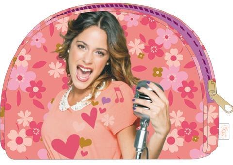 Dziewczęca kosmetyczka dla małej modnisi w kolorze łososiowym. Wykonana z połyskującego materiału ze zdjęciem głównej bohaterki z serialu "Violetta". Na zamku zawieszka z serduszkiem.