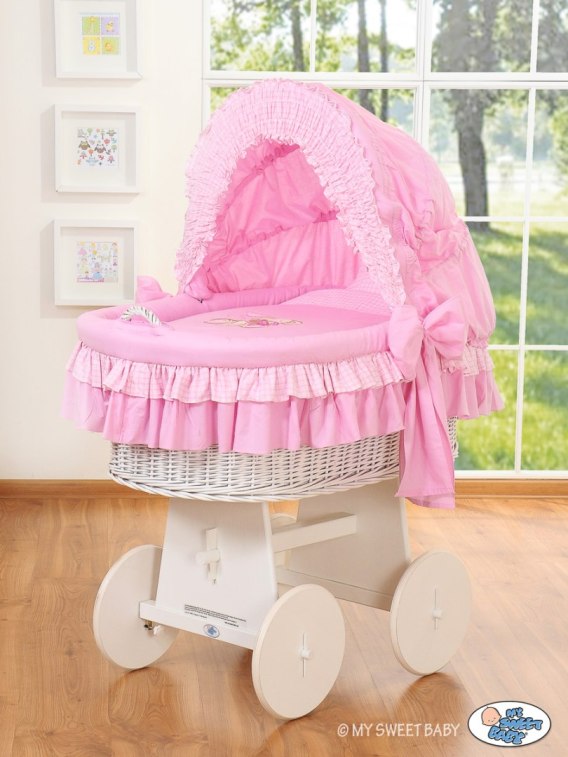 Piękny ręcznie pleciony wiklinowy kosz z oryginalnym dużym drewnianym podwoziem. Biały kolor wikliny i drewna. W komplecie obszycie i pościel w kolorze różowym (różowa bawełna, różowa kratka) z haftem.
