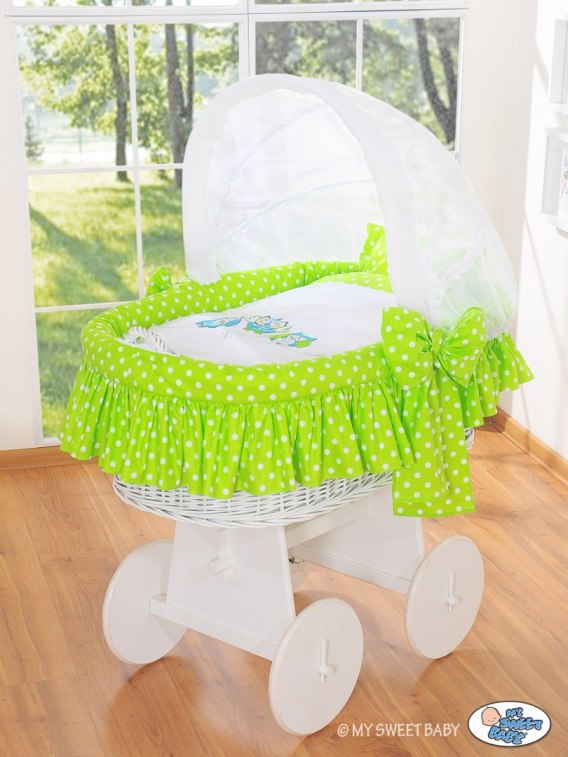 Piękny ręcznie pleciony wiklinowy kosz z oryginalnym dużym drewnianym podwoziem. Biały kolor wikliny i drewna. W komplecie obszycie i pościel w kolorze zielono-białym: białe grochy na zielonym z haftem. Obszycie na budkę wykonane z woalu.