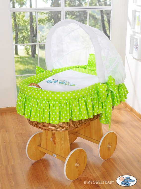 Piękny ręcznie pleciony wiklinowy kosz z oryginalnym dużym drewnianym podwoziem. Naturalny kolor wikliny i drewna. W komplecie obszycie i pościel w kolorze zielono-białym: białe grochy na zielonym z haftem. Obszycie na budkę wykonane z woalu.