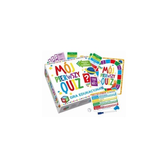 " Mój Pierszy Quiz" jest przede wszystkim grą zespołową i opis w dalszej części będzie dotyczył rozgrywki z udziałem drużyn. W przypadku, gdy graczy jest zbyt mało, można rozegrać turniej indywidualny, którego zasady są opisane na końcu instrukcji. Zawartość pudełka: plansza, pionek autko, kostka, mazak, suchościeralna tabliczka wyników, dzwonek- 2 szt.,karty pytań- 110 szt., instrukcja.