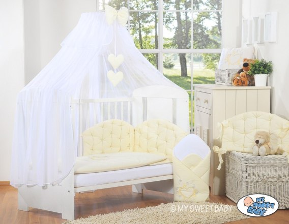 - Dwa wiszące serduszka z miękkim wypełnieniem to słodkie i niepowtarzalne uzupełnienie kompletu pościeli. Przyciągają uwagę dziecka w pierwszych miesiącach życia skutecznie zastępując karuzelkę. Duża gruba kokarda stanowi piękne zwieńczenie całości.
