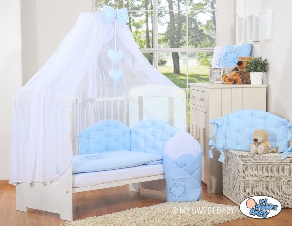Wiszące dwa serduszka + duża gruba kokarda - Dwa wiszące serduszka z miękkim wypełnieniem to słodkie i niepowtarzalne uzupełnienie kompletu pościeli. Przyciągają uwagę dziecka w pierwszych miesiącach życia skutecznie zastępując karuzelkę. Duża gruba kokarda stanowi piękne zwieńczenie całości.