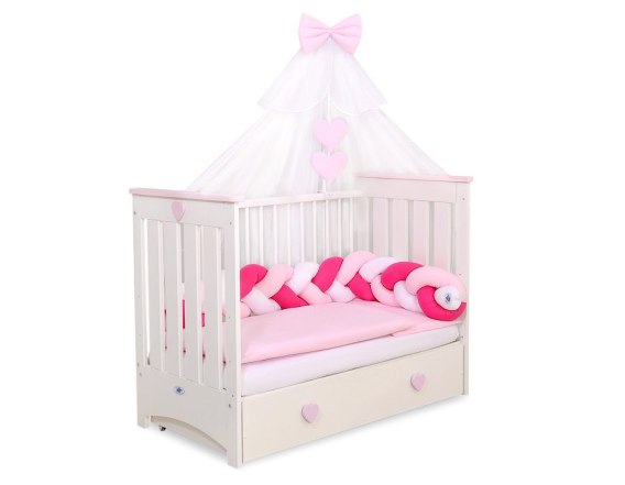 2. Wiszące dwa serduszka + duża gruba kokarda - Dwa wiszące serduszka z miękkim wypełnieniem to słodkie i niepowtarzalne uzupełnienie kompletu pościeli.Przyciągają uwagę dziecka w pierwszych miesiącach życia skutecznie zastępując karuzelkę. Duża gruba kokarda stanowi piękne zwieńczenie całości.