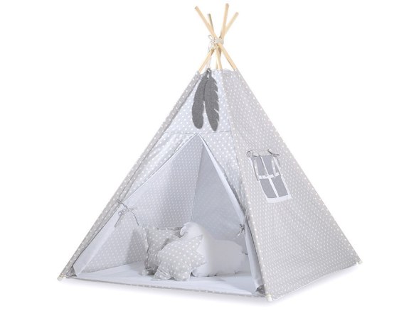 Namioty Tipi to idealne miejsce do zabawy dla Waszego Dziecka nie tylko w pokoju, ale i na tarasie, balkonie czy w ogrodzie. Dzięki specjalnej konstrukcji namiot łatwo się składa i jest bardzo lekki, dzięki czemu można go swobodnie przenosić i ustawiać w dowolnym miejscu. Wykonany został z dbałością o każdy szczegół, aby był bezpieczny i stabilny podczas zabawy. Kije, które budują tipi, zostały ukryte w specjalnych tunelach - w górnej części związane są sznurkiem mocującym, a u dołu zostały wykończone specjalną plastikową nakładką. Całkowita wysokość, na którą rozkłada się namiot wynosi 150cm. Średnica dolnej części Tipi wynosi ok. 130cm. Obszycie namiotu jest rozbieralne, można go prać w pralce. W bocznej ścianie namiotu znajduje się okienko z zasłonką, a wejście do namiotu posiada specjalne troczki, które można związać tak, aby dziecko miało swobodne przejście do namiotu i na zewnątrz. Po opuszczeniu zasłonek przy wejściu, namiot może stanowić idealną kryjówkę podczas zabawy.