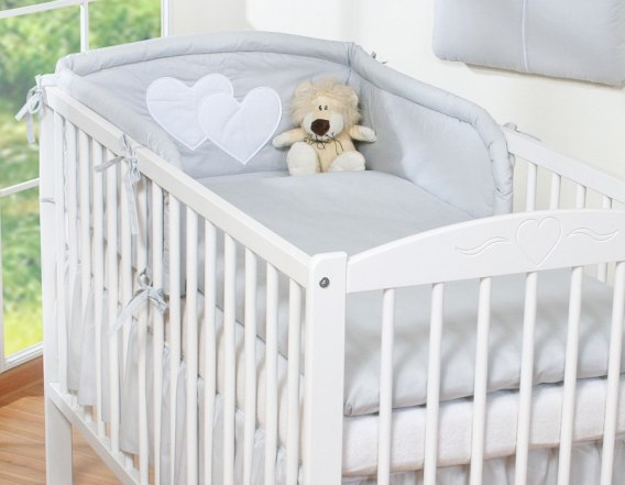 3.Ochraniacz uniwersalny zaokrąglony 35x188cm.Wysoki i sprężysty ochraniacz doskonale amortyzuje i ochroni Twoje Maleństwo przed twardymi szczebelkami łóżeczka. Specjalnie skonstruowany i z dodatkowymi przeszyciami, tak by idealnie pasował zarówno na łóżeczko 120x60 cm, jak i na większe łóżeczko-tapczanik 140x70 cm, będzie więc wam dłużej służył. Zagłówek ozdobiony dużymi aplikacjami serduszek, pięknie obszytymi atłasową lamówką . Ochraniacz wypełniony jest grubą warstwą sprężystej antyalergicznej włókniny silikonowej, dzięki czemu ładnie układa się na łóżeczku. Włóknina posiada certyfikat Ökotex. Ochraniacz na łóżeczko wykonany jest z najwyższej jakości bawełny, która nie spiera się, "nie mechaci" i nie traci swoich właściwości nawet po wielu praniach. Bawełniane mocne troczki umożliwiają łatwe i solidne przymocowanie ochraniacza do łóżeczka dziecięcego.