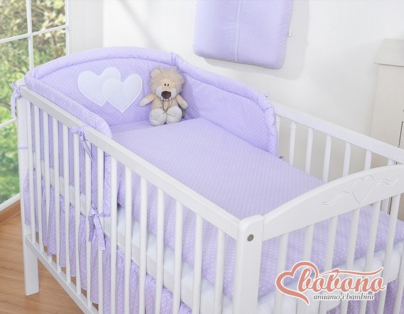 3.Ochraniacz uniwersalny zaokrąglony 35x188cm.Wysoki i sprężystyochraniacz doskonale amortyzuje i ochroni Twoje Maleństwo przed twardymi szczebelkami łóżeczka. Specjalnie skonstruowany i z dodatkowymi przeszyciami, tak by idealnie pasował zarówno na łóżeczko 120x60 cm, jak i na większe łóżeczko-tapczanik 140x70 cm, będzie więc wam dłużej służył. Zagłówek ozdobiony dużymi aplikacjami serduszek, pięknie obszytymi atłasową lamówką . Ochraniacz wypełniony jest grubą warstwą sprężystej antyalergicznej włókniny silikonowej, dzięki czemu ładnie układa się na łóżeczku. Włóknina posiada certyfikat Ökotex. Ochraniacz na łóżeczko wykonany jest z najwyższej jakości bawełny, która nie spiera się, "nie mechaci" i nie traci swoich właściwości nawet po wielu praniach. Bawełniane mocne troczki umożliwiają łatwe i solidne przymocowanie ochraniacza do łóżeczka dziecięcego.