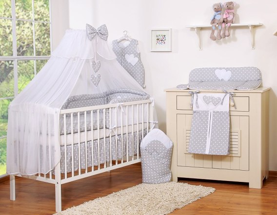 Pościel 5-cz z moskitierą - Wiszące Serduszka białe grochy na szarym
