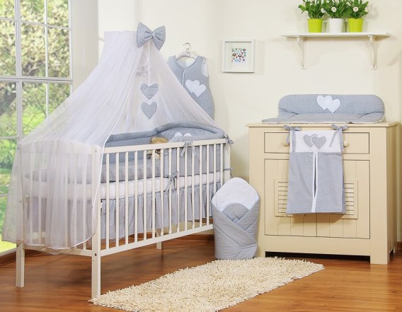 Niepowtarzalny zestaw pościeli 5- elementowej z przepiękną aplikacją serduszek. Nie podrażnia delikatnej skóry dziecka. Wysoki ochraniacz doskonale amortyzuje i ochroni Twoje Maleństwo przed twardymi szczebelkami łóżeczka. Wykonana z trwałej 100% atestowanej bawełny, bezpiecznej dla delikatnej skóry dziecka. W tej pościeli Wasze dziecko będzie spało spokojnie i bezpiecznie.