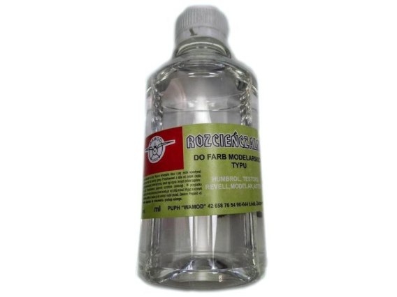 Rozcieńczalnik jest roztworem służącym do rozcieńczania olejnych farb modelarskich. Można go zastosować do praktycznie wszystkich produkowanych farb. Należy go dodawać powoli, cały czas mieszając intensywnie farbę. Dobrym pomysłem jest zalewanie zgęstniałych farb cienką warstwą, o ile nie będziemy ich używać przez jakiś czas. Warstwa rozpuszczalnika nie może być zbyt duża, bowiem podczas przygotowania farby do malowania po jej wymieszaniu może być za rzadka. Jest to także doskonały preparat do usuwania samoprzylepnych, papierowych nalepek, ułatwia zdejmowanie folii samoprzylepnych i usuwa ślady kleju. Nalepkę trzeba po prostu zwilżyć kilkakrotnie i oderwać. Jeśli jest z papieru kredowanego można położyć na chwilę cienką warstwę ligniny nasączoną płynem. W czasie odrywania folii można sobie to ułatwić smarując pędzelkiem dolną warstwę folii powleczoną klejem. Potem tylko wystarczy zetrzeć zwilżoną rozcieńczalnikiem szmatką resztki kleju.