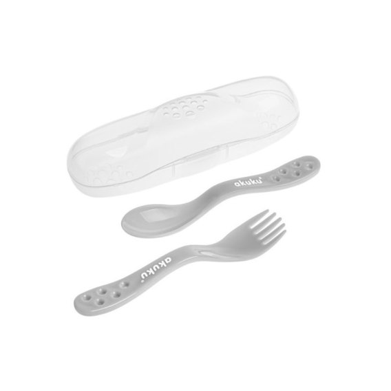 Zestaw wyprofilowanych sztućców: widelec i łyżeczka. Wyposażone w praktyczne etui dzięki czemu sprawdzą się poza domem - na spacerach i w podróży. Wykonane z bezpiecznych, wysokiej jakości materiałów przeznaczonych do kontaktu z żywnością. Zaokrąglone kształty sztućców są odpowiednio dostosowane do delikatnych dziąseł małego dziecka. Produkt całkowicie wolny od bisfenolu A (0% BPA).