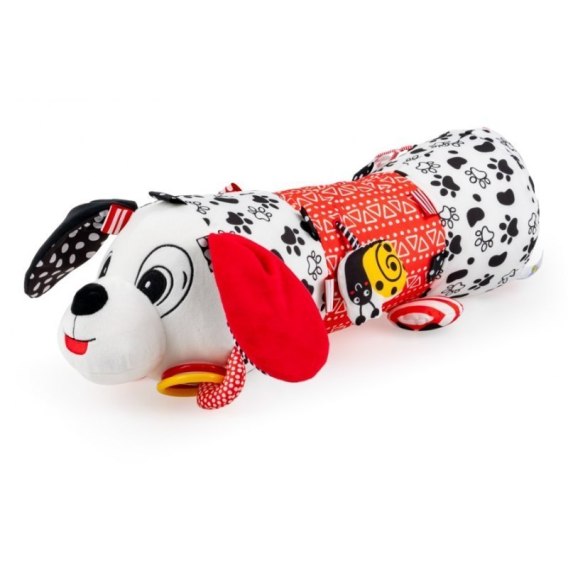 Piesio Pedro najlepszym przyjacielem każdego malucha! Ten wielofunkcyjny wałek stanowić będzie wsparcie dla dziecka leżącego na brzuszku. Zdobią go przeróżne ozdoby i zabaweczki, których zadaniem jest pobudzić zmysły bobasa i zapewnić mu rozwojową zabawę. Znajdziemy tu grzechoczące kółeczko, piszczałkę, kolorowe elementy, a także tasiemkę do przeciągania, którą z jednej strony zdobi materiałowy ślimaczek, a z drugiej strony, miękki gryzak z wypustkami, który przyniesie ulgę podczas ząbkowania. Uszy psiaka wesoło szeleszczą. Wałek wykonany został z materiałów o zróżnicowanych fakturach i kontrastowych kolorach, co pomoże maluchowi rozwijać zdolności poznawcze.