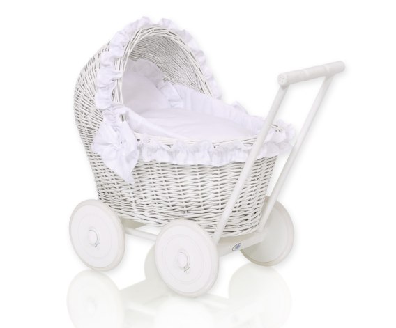 Wiklinowy wózek dla lalek pchacz biały z białą pościelką i miękką wyściółką CHIARA