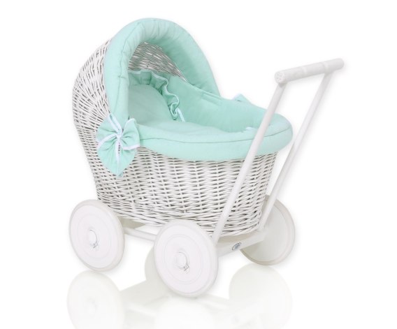 Wiklinowy wózek dla lalek pchacz biały z miętową pościelką i miękką wyściółką STELLA