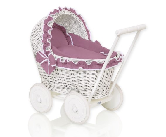 • Wiklinowy wózek dla lalek pchacz biały z pościelką róż retro i miękką wyściółką CHIARA
