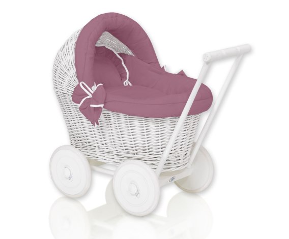 • Wiklinowy wózek dla lalek pchacz biały z pościelką róż retro i miękką wyściółką STELLA