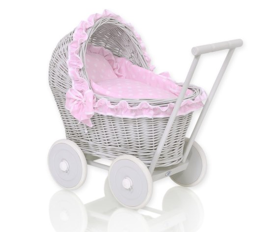 Wiklinowy wózek dla lalek pchacz szary z różową pościelką i miękką wyściółką CHIARA