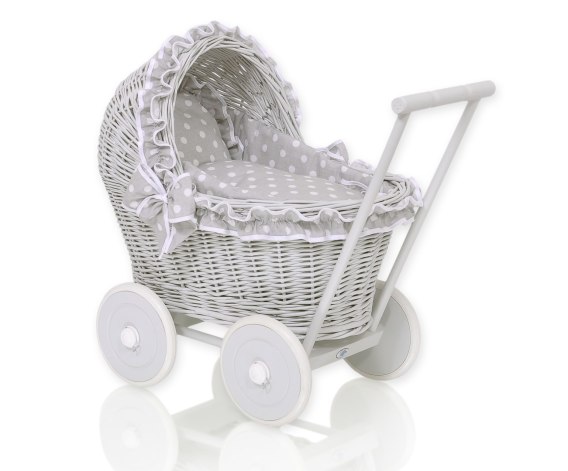 Wiklinowy wózek dla lalek pchacz szary z szarą pościelką i miękką wyściółką CHIARA