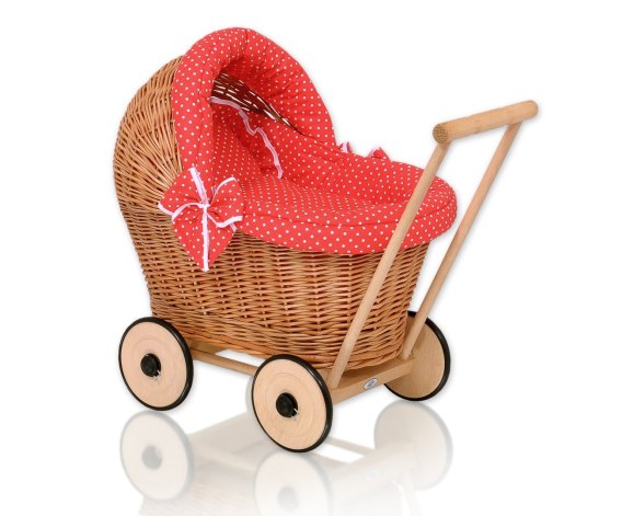 Wiklinowy wózek dla lalek pchacz z czerwoną pościelką i miękką wyściółką STELLA - naturalny