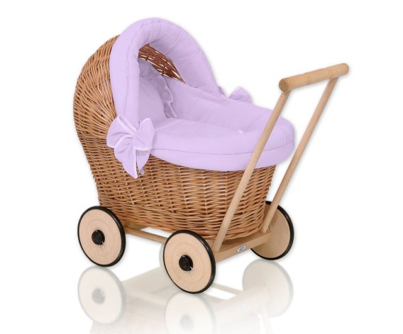 • Wiklinowy wózek dla lalek pchacz z fioletową pościelką i miękką wyściółką STELLA - naturalny