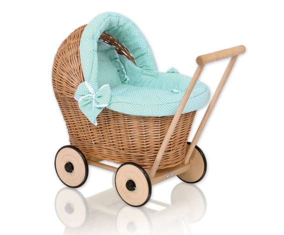 Wiklinowy wózek dla lalek pchacz z miętową pościelką i miękką wyściółką STELLA - naturalny