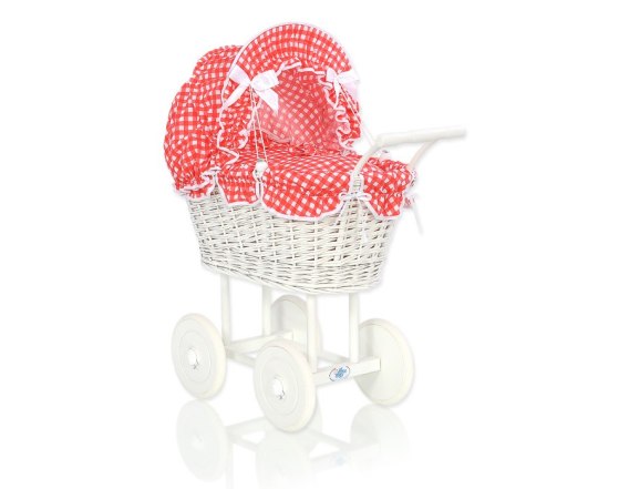 Wiklinowy wózek dla lalek wysoki z czerwoną pościelką i wyściółką- biały