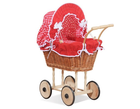 Wiklinowy wózek dla lalek wysoki z czerwoną pościelką i wyściółką- naturalny