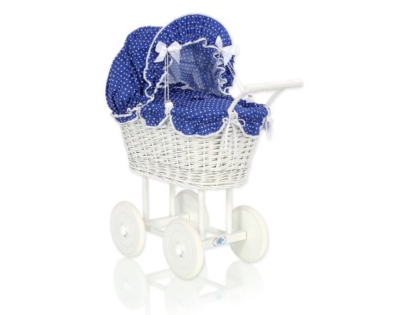 Wiklinowy wózek dla lalek wysoki z granatową pościelką i wyściółką- biały