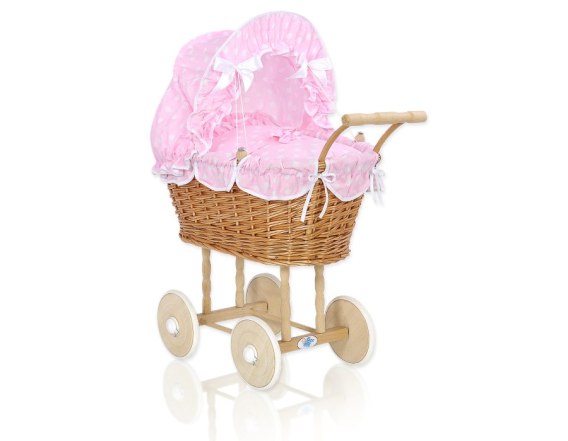 Wiklinowy wózek dla lalek - z naturalnej wikliny, na naturalnym wysokim drewnianym podwoziu z drewnianymi kółkami.