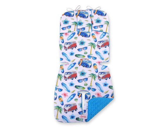 Dwustronna-wykonana ze 100% bawełny oraz przyjemnego w dotyku mięciutkiego polaru minky. Specjalne atestowane wypełnienie wkładki gwarantuje optymalną sprężystość i miękkość. Praktyczna wkładka chroni delikatną skórę dziecka przed syntetycznym obiciem wózka. Zapewnia wygodę podczas spaceru. Zabezpiecza wózek przed zabrudzeniami. Wkładka posiada 3 praktyczne otwory i dwa głębokie wcięcia na 5-punktowe pasy bezpieczeństwa. Jest uniwersalna, pasuje do większości rodzajów wózka.