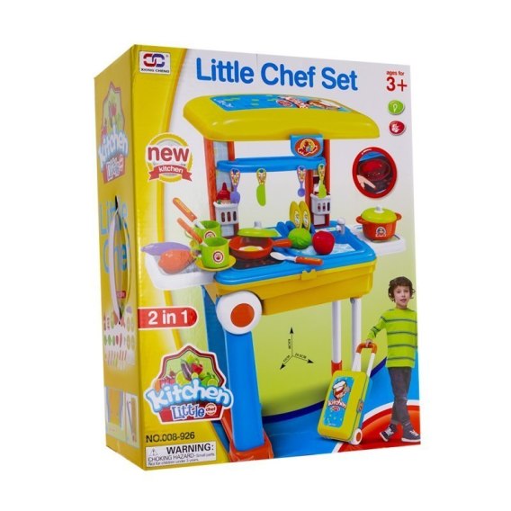 Stolik-walizka kuchnia dla najmłodszych kucharzy. Zapewni dziecku wiele godzin rozrywki i rozwinie u niego koordynację wzrokowo-ruchową oraz abstrakcyjne myślenie. Pozwala na zabawę dziecka z rodzicem. Stolik da się całkowicie spakować do walizki na kółkach. Do zestawu dołączona jest płyta podświetlana wydająca odgłos gotującej się wody. Płyta posiada guziki sterowania (on/off) oraz regulację poziomu gotowania.
