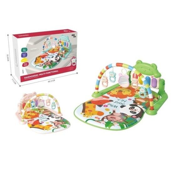 Zestaw zawiera: Pianinko z świecącymi klawiszami, matę, pałąk z 4 zabawkami i lusterkiem.