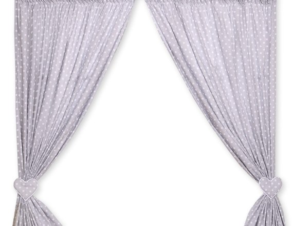 Piękny komplet zasłonek z serduszkami i szarfami do związania po bokach. Wykonane z tkaniny bawełnianej. Góra zasłonek obszyta taśmą do łatwego i równego zmarszczenia. Idealnie uzupełniają pokój dziecięcy tworząc harmonijną całość z pościelą na łóżeczku.